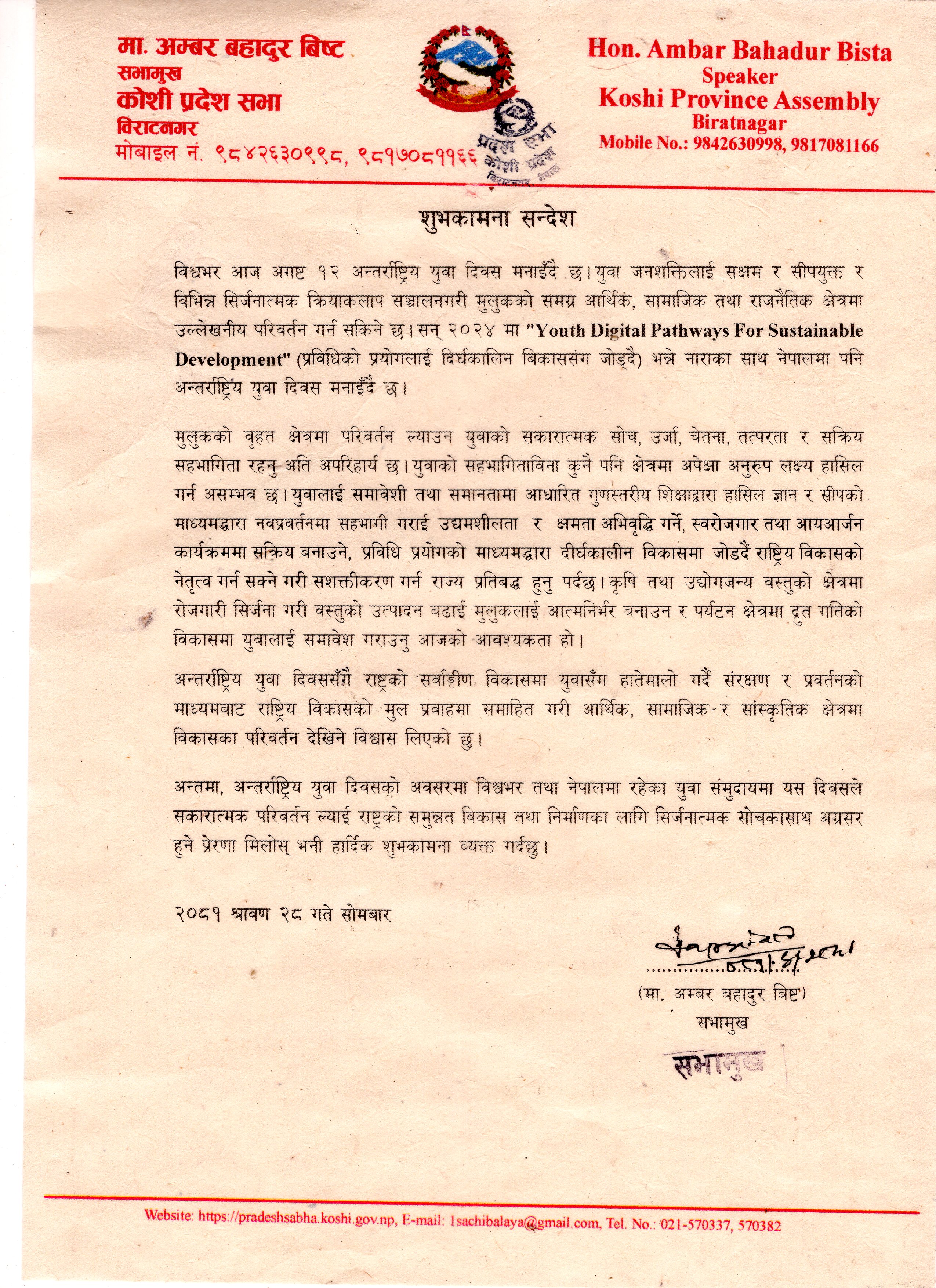 अन्तर्राष्ट्रिय युवा दिवसको अवसरमा माननीय सभामुखज्यूको शुभकामना