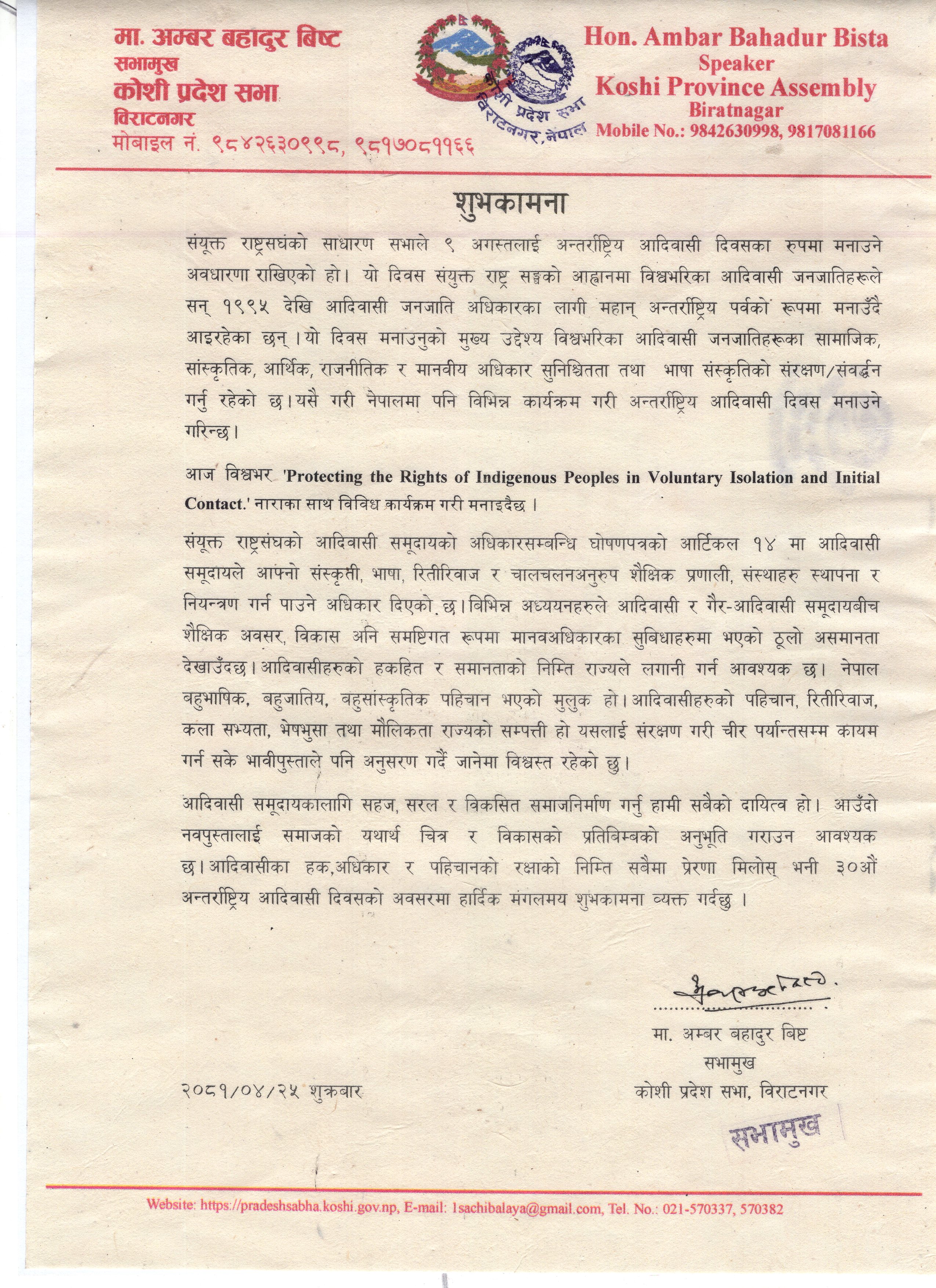 अन्तर्राष्ट्रिय आदिवासी दिवसको अवसरमा माननीय सभामुखज्यूको शुभकामना
